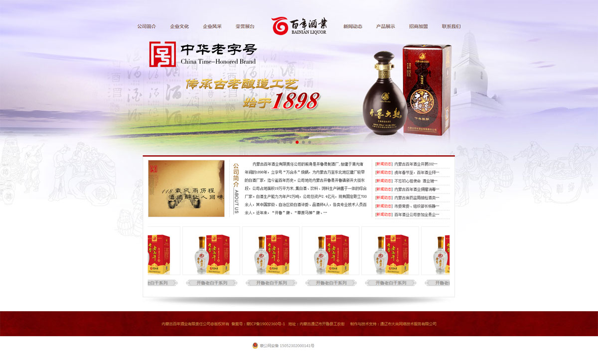 內(nèi)蒙古百年酒業(yè)有限責(zé)任公司的前身是開魯制酒廠,始建于1898年的“萬合永”燒鍋,迄今已有120多年釀酒歷史。企業(yè)歷經(jīng)了個體、國營、轉(zhuǎn)制的變革和發(fā)展,現(xiàn)已成為集白酒、木糖、飼料生產(chǎn)銷售于一體的自治區(qū)農(nóng)牧產(chǎn)業(yè)化重點(diǎn)龍頭企業(yè),是通遼域內(nèi)首家榮獲國家商務(wù)部頒發(fā)的“中華老字號”企業(yè)。